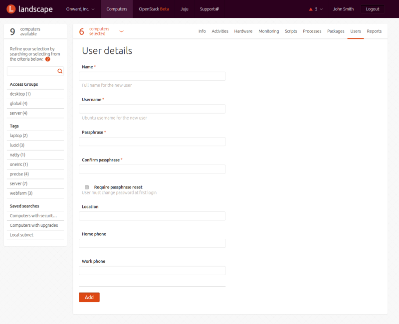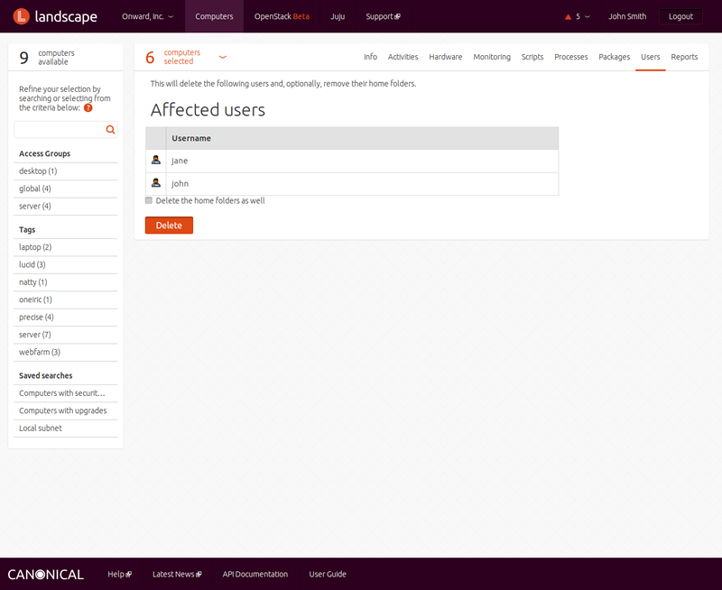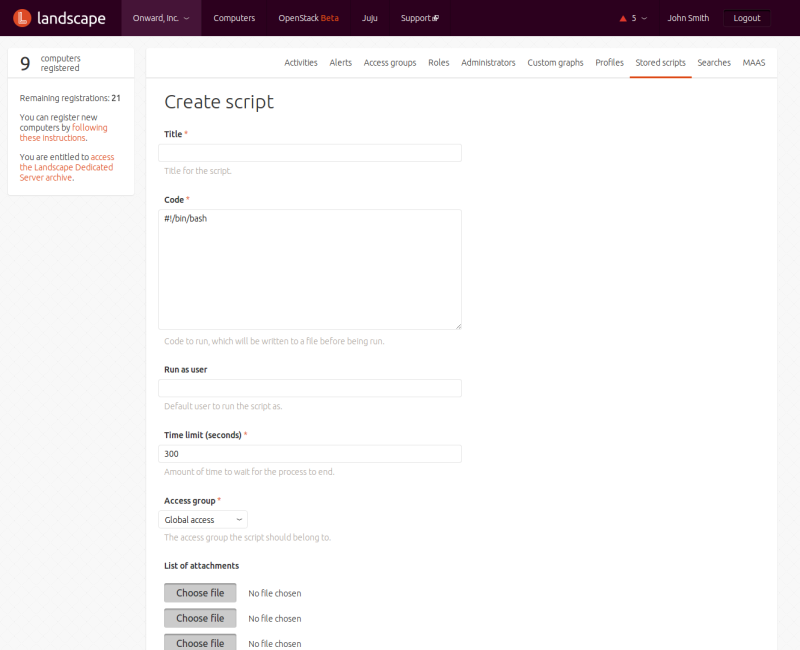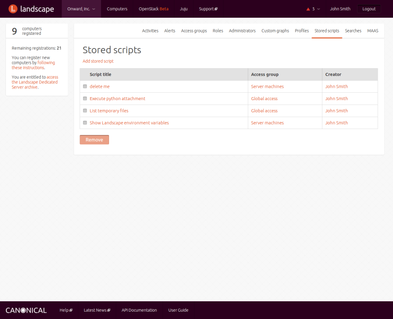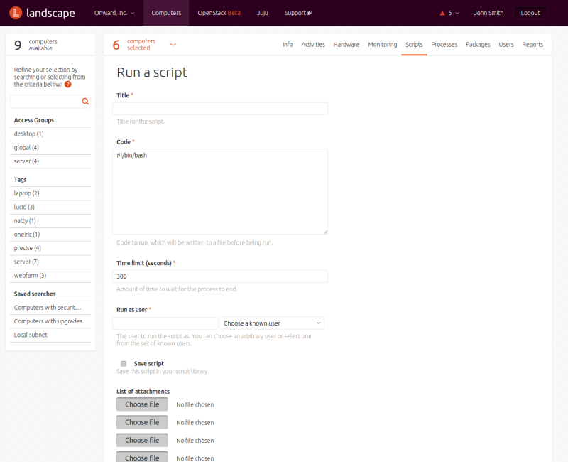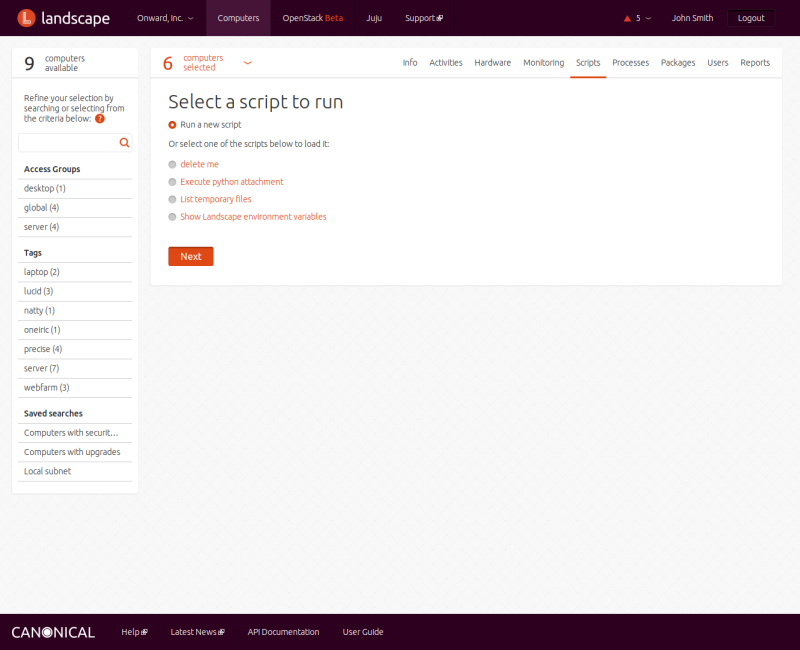 Landscape lets you run scripts on the computers you manage in your account. The scripts may be in any language, as long as an interpreter for that language is present on the computers on which they are to run. You can maintain a library of scripts for common tasks. You can manage scripts from the menu under your account, and run them against computers from the menu under .